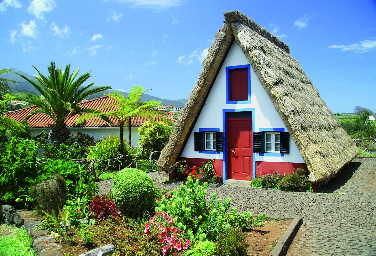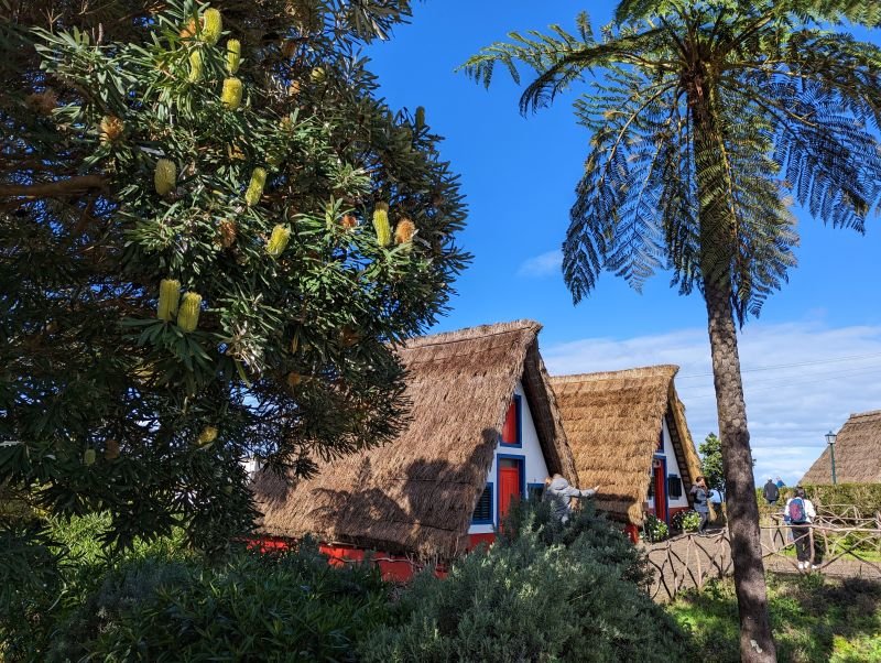 Nun fahren wir an die Nordküste Madeiras. Hier in Santana haben sich die ursprünglichen Häuschen im madeirensischen Stil erhalten. Sie haben eine dreieckige Form und tragen Strohdächer.