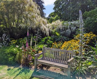 Der Garten, im Besitz von Sue Pomeroy und Will Soos, liegt eingebettet zwischen vier majestätischen Bergen und öffnet sich zu einer überwältigenden Aussicht auf das Meer. Vom warmen Golfstrom gestreichelt, gedeihen hier exotische Pflanzen, die man auf diesem Breitengrad kaum erwarten würde – ein botanisches Wunder der Natur.
